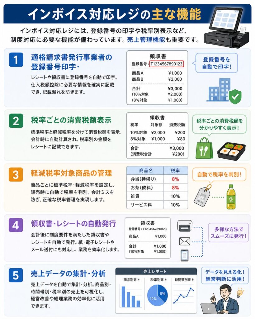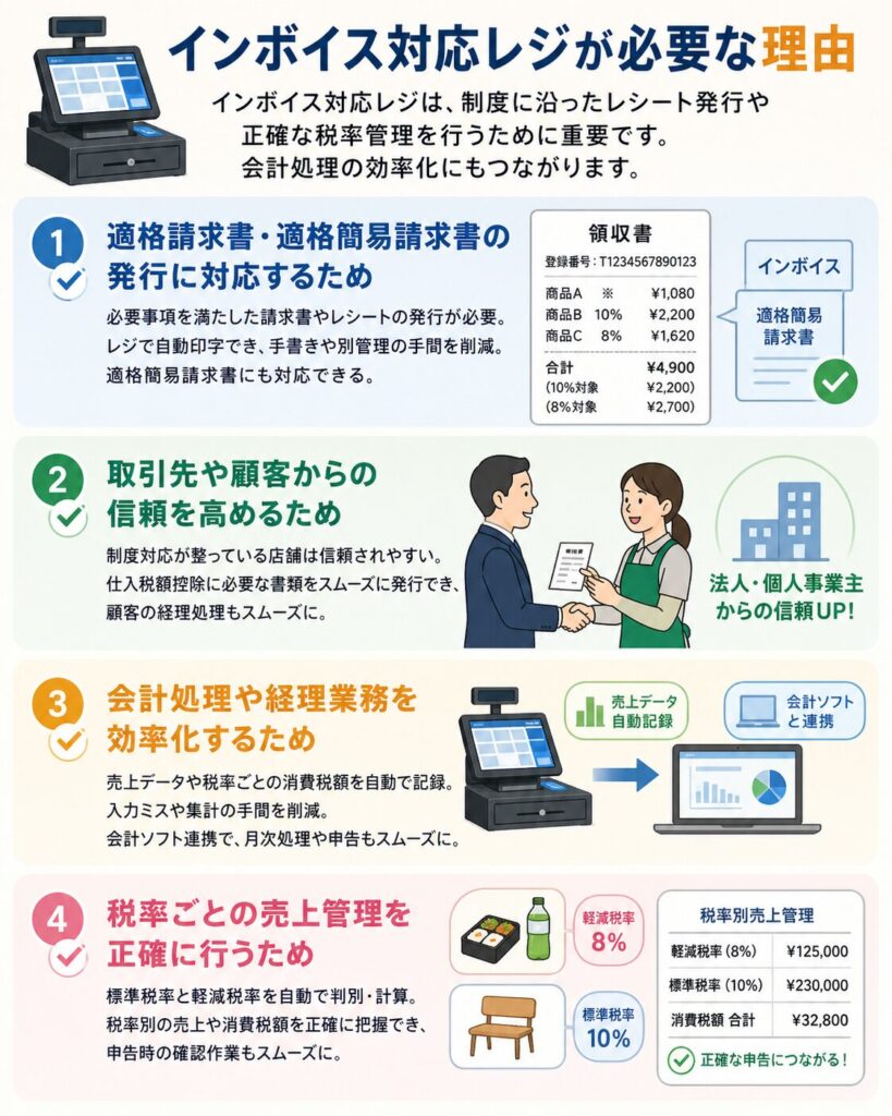 インボイス制度の開始により、レジには「登録番号の印字」や「税率ごとの消費税額表示」など、従来より高度な対応が求められるようになりました。