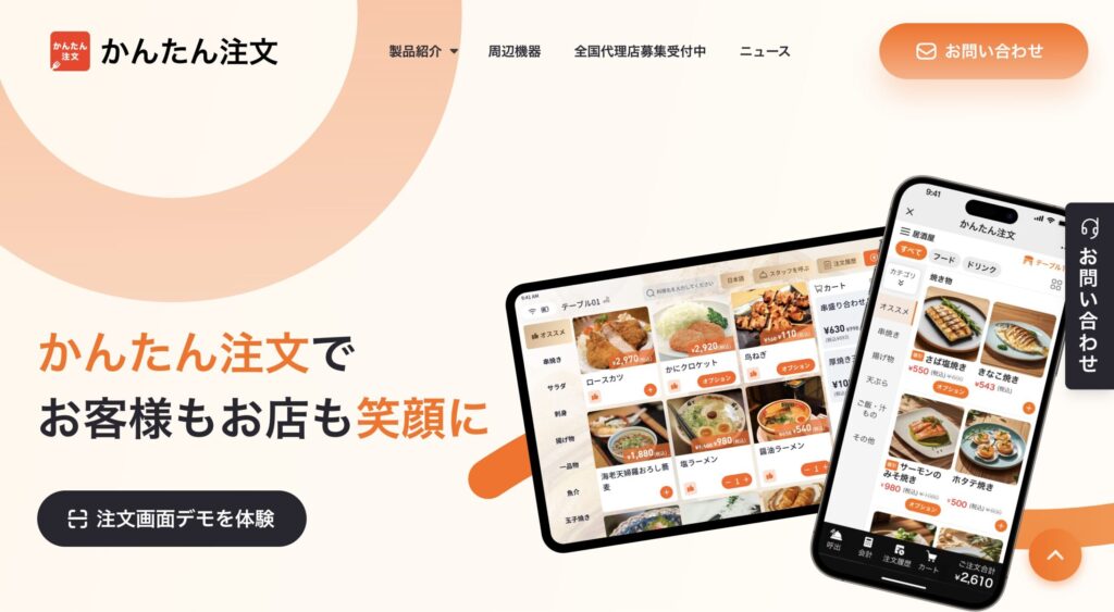 | かんたん注文 | 要問合せ | 要問合せ | 要問合せ | ・スマホ1台で完結するシンプル設計 ・直感的な操作で誰でも使いやすい ・IT導入補助金の対象 | ・外部連携ツールのバリエーションが少ない ・スマホ操作が苦手なスタッフには不向きな可能性 |