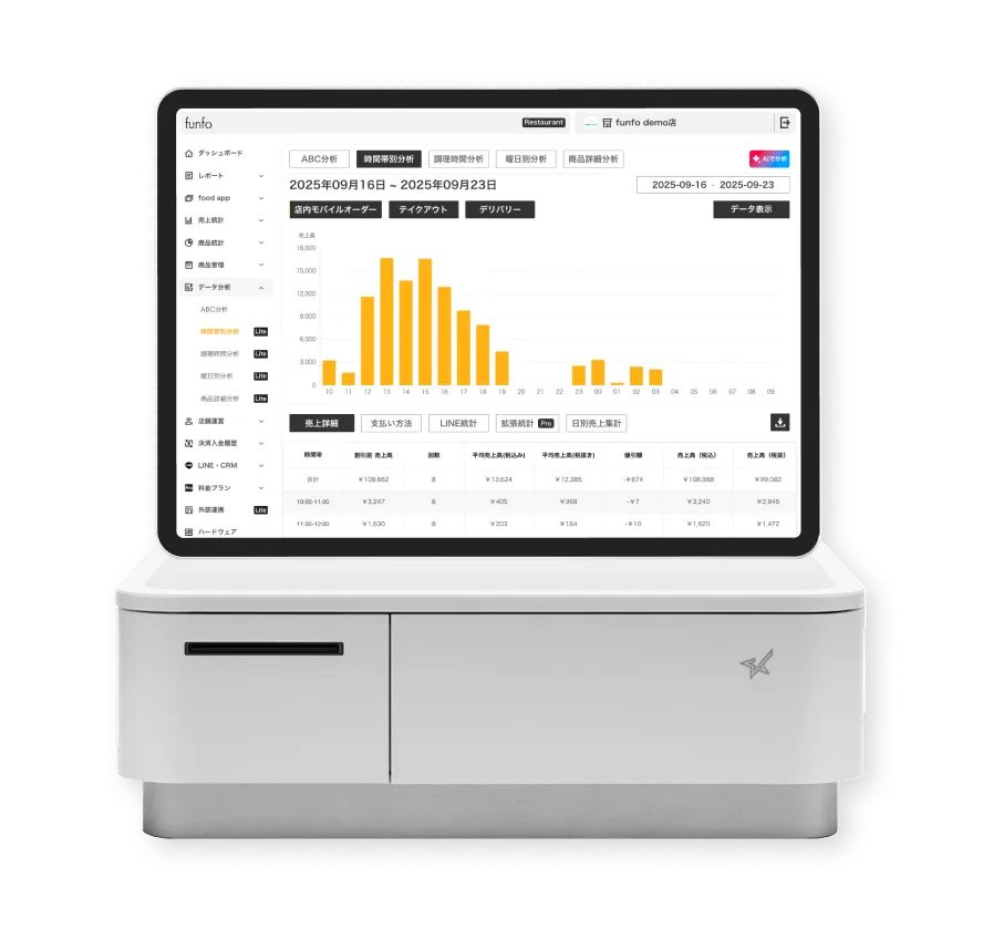 | 売上管理 | 日別・時間帯別・商品別の売上を自動集計し、客単価や売れ筋を把握して改善に活かせる |