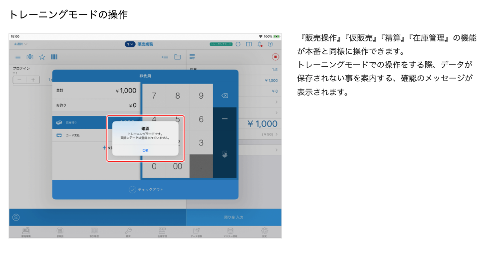 この機能の大きな特徴は、金額ミスや誤操作を気にせず繰り返し操作できる点です。新人やアルバイトが初めてPOSレジに触れる場合でも、実際のお客様を待たせたり、売上データを壊したりする心配がありません。