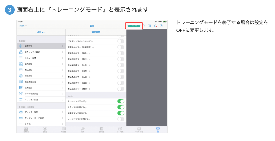 さらに、トレーニングモードを使えば、返品処理やキャンセル操作、エラー時の画面表示など、本番では試しにくい操作も事前に確認できるため、現場でのトラブル対応力向上にもつながります。