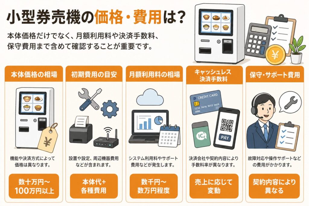 小型券売機は大型機に比べて導入しやすいものの、本体価格や設置費、初期設定費などの初期費用が発生します。キャッシュレス決済やPOS連携などの機能を追加すると、費用が高くなる場合もあります。