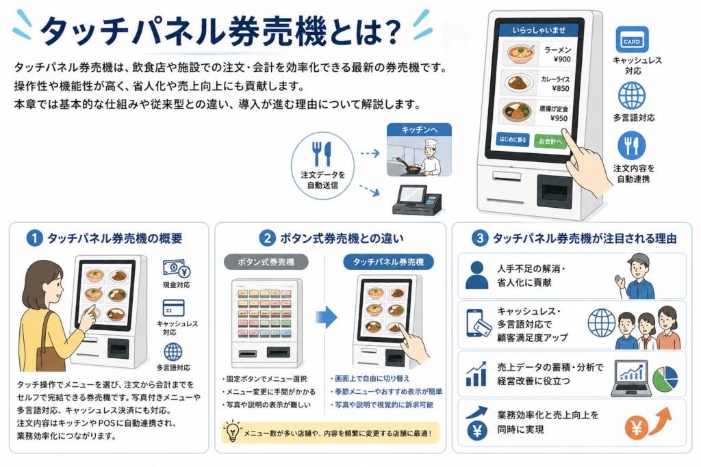 タッチパネル券売機とは、画面に表示されたメニューをタッチ操作で選択し、注文から会計までをセルフで完結できる券売機です。写真付きメニュー表示や多言語対応が可能で、直感的に操作できるのが特徴です。