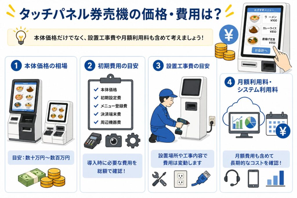 タッチパネル券売機の価格相場は、約80万円〜250万円程度が一般的です。現金対応タイプは釣銭機や紙幣識別機を搭載するため150万円〜250万円前後、キャッシュレス専用モデルであれば50万円〜100万円程度から導入できます。